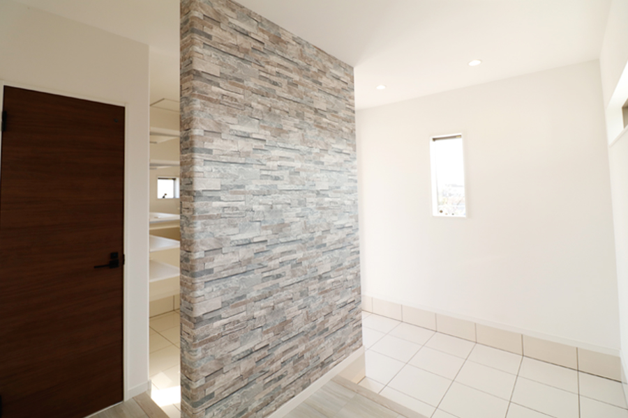 シューズクロークの前の壁は、グレーのストーン調のクロスで上品な空間に