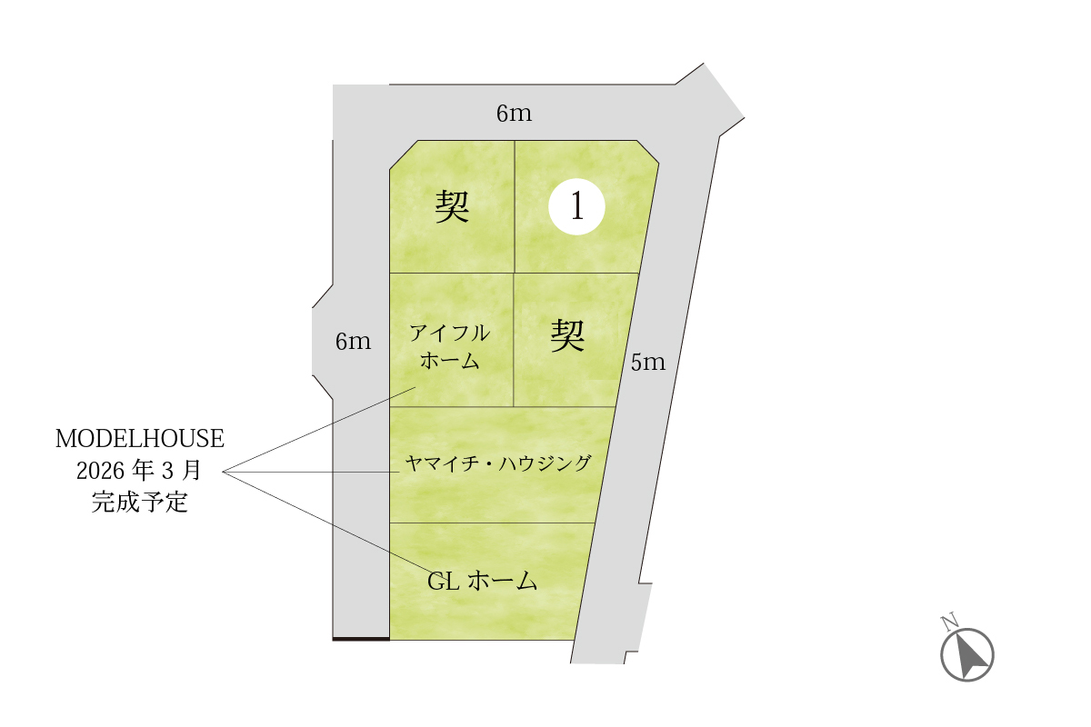 | その他 | ■販売区画面積/155.71㎡■販売価格/825万■総区画数/6■販売区画数/1■私道負担:無■道路:5m・6m■建築条件付き■売主 ※徒歩分数は80m=1分、自転車分数は250m=1分、自動車分数は40㎞=1分として算出(端数切り上げ)した概測時間です。※建築条件付の土地は土地売買契約後3ヶ月以内に売主と住宅の建築請負契約を締結していただくことを条件として販売いたします。この期間内に住宅を建築しないことが確定したとき、又は、建築請負契約が成立しなかった場合は土地売買契約は白紙となり、受領した金銭は全額お返しいたします。※掲載の全体区画図イメージイラストは図面を基に描き起こしたもので、イメージにつき実際とは異なります。 |