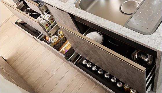 ソフトクローズレール採用で静かでスムーズな開閉が可能です。奥までたっぷり収納でき、巾木部分にも収納できます。 ※食器洗浄乾燥機下は、巾木収納ではございません。 ※ガスキャビネット横小引出しは、ソフトクローズ無しとなります。