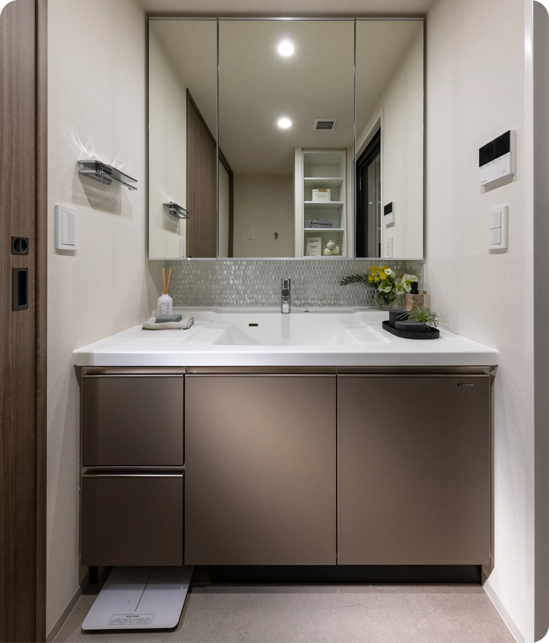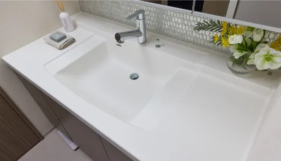 継ぎ目のない美しい人造大理石と洗練されたスクエアデザインが魅力のボウル一体型カウンターを洗面化粧台に採用しています。