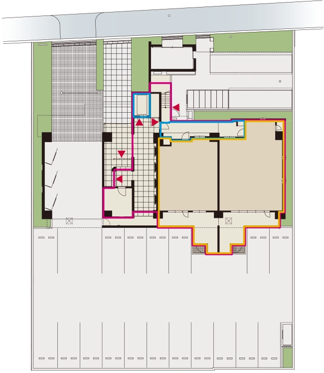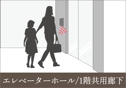 非接触キーをリーダにかざすことで、エレベーター扉が開き、居住階が自動登録されます。また、1階の共用廊下への扉が開錠されます。