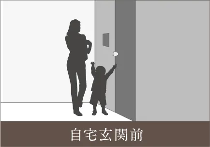 バルコニー、サービスバルコニー(1階除く)、テラスに面する全ての窓と2階(Aタイプ)、13階(A・Dタイプ)と全ての住戸の玄関扉にマグネット式の防犯センサーを設置。セキュリティを警戒モードにしている時に扉が開けられるとセンサーが反応。住戸内のインターホン親機と玄関子機が警報を発し、フロントオフィス(管理事務室)と警備会社に自動通報します。 ※設置位置の詳細は図面集をご確認ください。