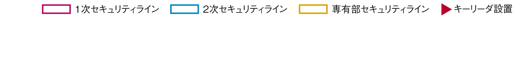 日々の暮らしの安心を支える、3つのセキュリティを設けました。エントランスのオートロックによる1次セキュリティ。非接触キーの採用でリーダにキーをかざすだけで解錠可能です。次に、2次セキュリティとして1階エレベーターホールでは非接触キーをリーダにかざすことでエレベーター扉が開き、居住階が自動登録されます。さらに、住戸玄関にはダブルロック等の防犯機能を採用し、3次のセキュリティを構築しました。また、共用部の各所に設置した防犯カメラや各住戸玄関前カメラなどのセキュリティが、日々の安全性を高めます。
