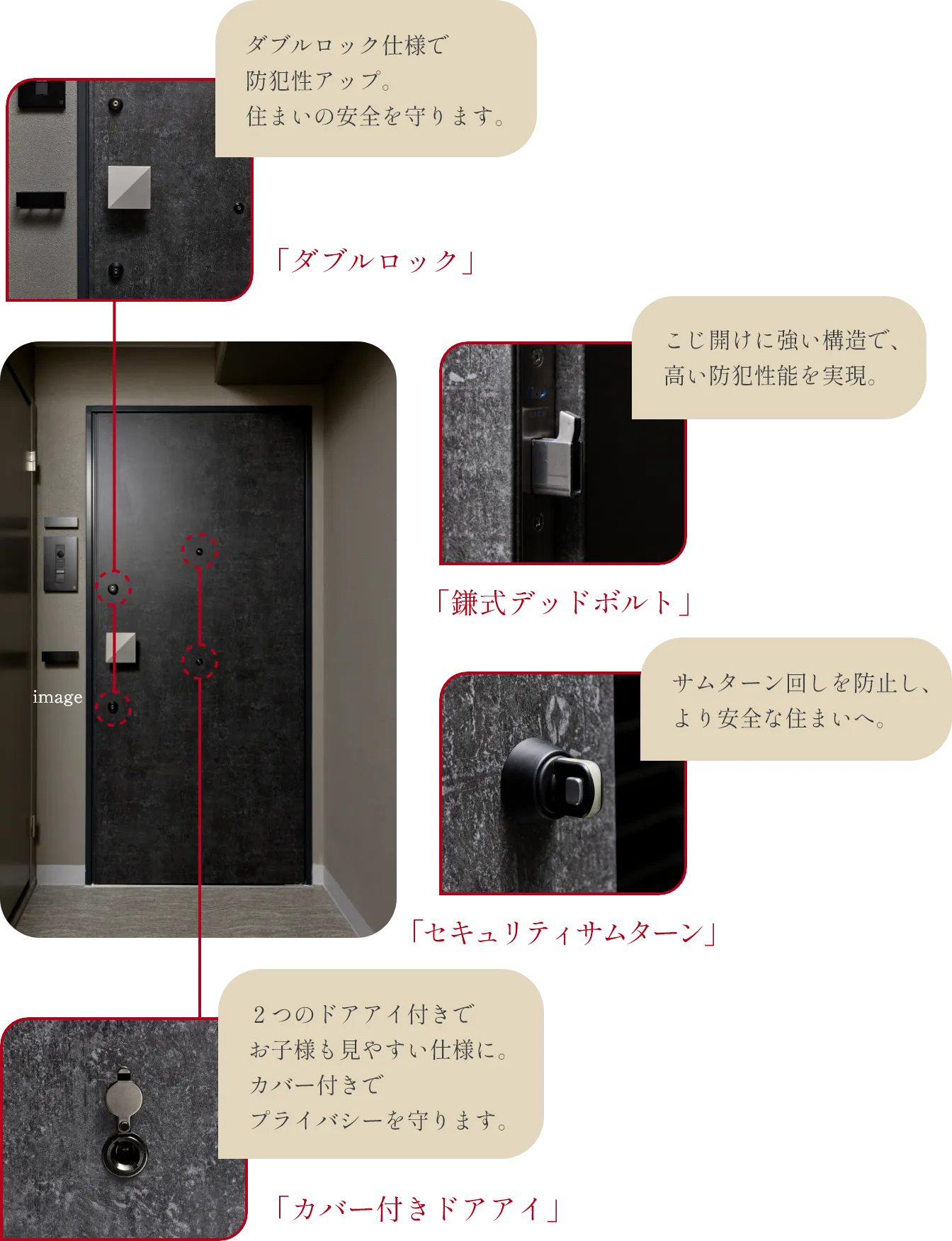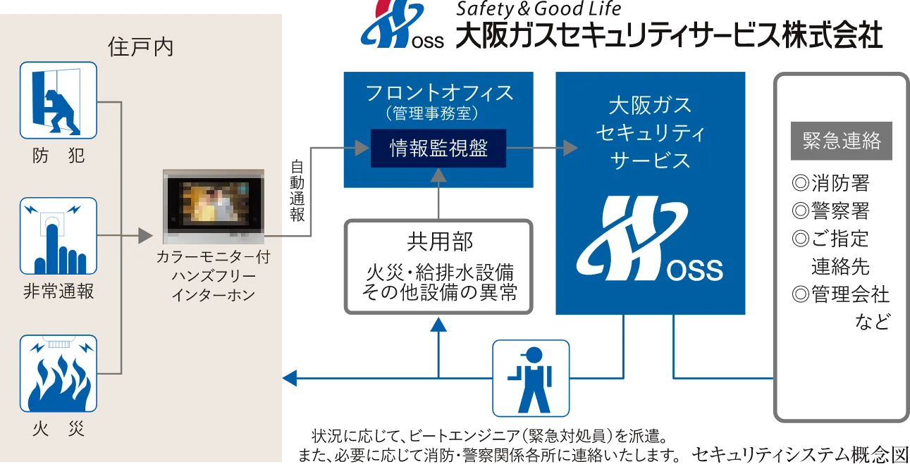 共用部の防犯カメラ、住戸ごとの防犯センサーなど、