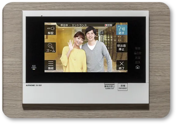 来訪者を住戸内から確認できるカラーモニター付インターホンを採用。さらに全住戸の玄関前にもカメラを設置。共用エントランスと玄関前の2カ所で、音声と映像で確認できます。またカラーモニター付インターホンには火災・非常通報のセキュリティ機能と、宅配ボックス着荷表示機能を装備。不在時には、来訪者を録画及び録音できます。