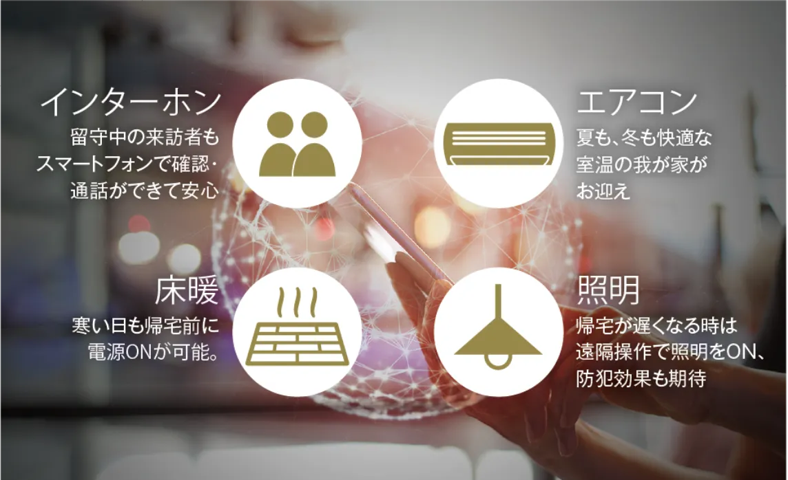 IoTとは「Internet of Things」の略で、モノがインターネットにつながることを意味しています。家電や住宅設備等の「モノ」がインターネットとつながることで、外出先からエアコンや照明等の操作ができるように。先進のIoTシステムが、暮らしに一歩進んだ便利と快適をお届けします。