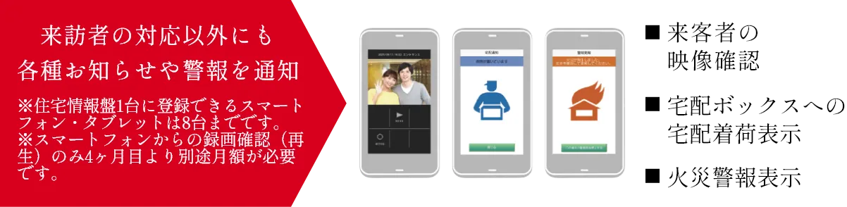 スマートフォンやタブレットとの連動が可能なカラーモニター付きインターホンを採用。これにより外出先でも、来訪者の映像確認や通話が可能です。また火災警報表示や宅配物の着荷表示など各種警報やお知らせも、スマートフォンやタブレットに通知します。