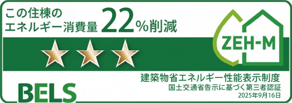 3つ星の評価を取得。 - BELS(ベルス)とは、第三者機関によって全ての建築物を対象とした、省エネルギー性能に関する評価・表示を行う、建築物省エネルギー性能表示制度。「ユニハイム御堂筋あびこ」は、断熱性の向上や高効率な設備機器の導入等によって住棟全体での一次エネルギー消費量を削減し、3つ星の評価を取得いたしました。