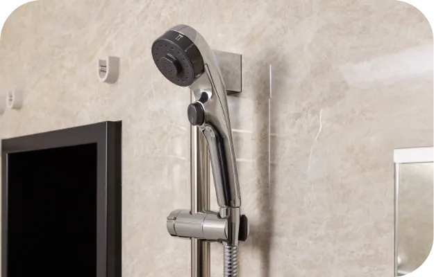 - eシャワー吐水(節水タイプ)シャワーヘッド内に渦を発生させる16ヶの部屋を設け、それぞれの部屋から一気に散水することで低流量でも浴び心地の良い快適なシャワーを実現しました。