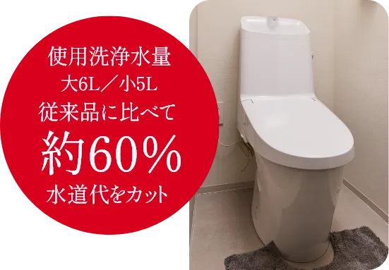 - 一般家庭内ではトイレは使用水量が多く、全体の21%も使用しています。この貴重な水を大切に使うことを考え、強い洗浄力はそのままに従来品より大幅に洗浄水量を減らしました。「超節水ECO6」トイレなら大13L便器と比べ約60%、大8L便器と比べ約34%節水出来ます。 【試算条件】4人家族(男性2人、女性2人)が大1回/人・日、小3回/人・日使用した場合で算出。