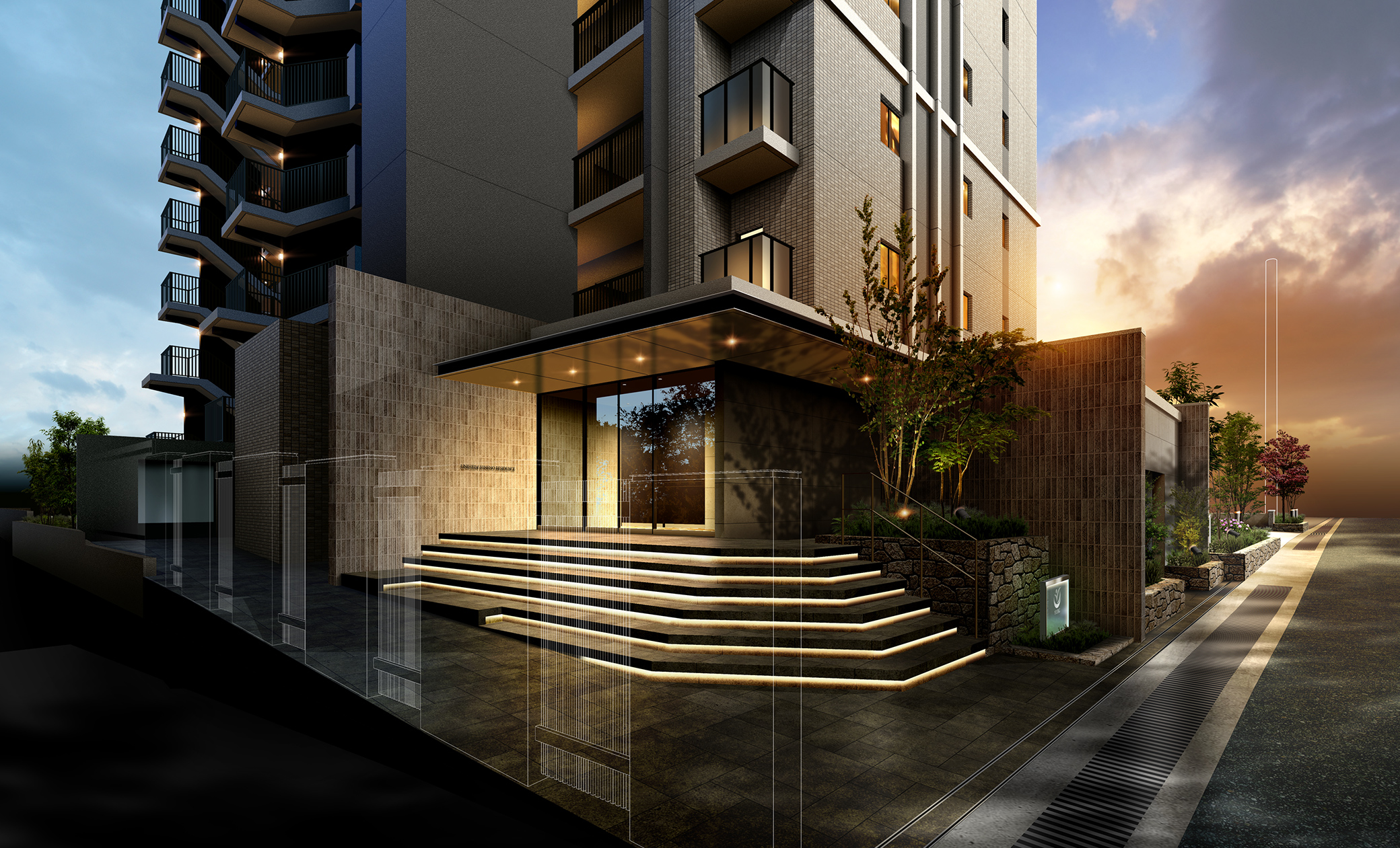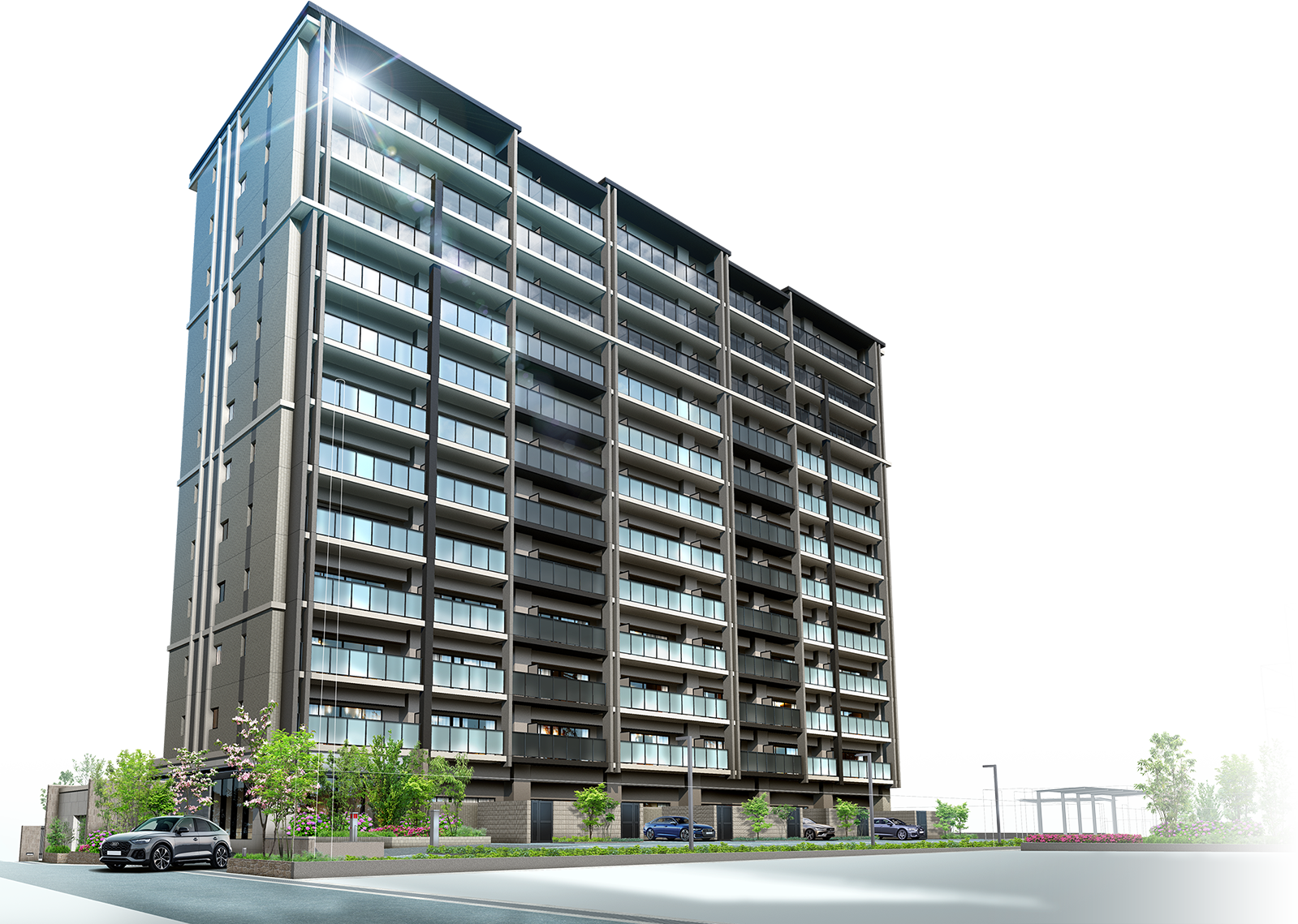 ※掲載の各完成予想図は設計図を基に描き起こしたもので官公庁の指導、施工上の都合等により建物の形状・色調・植栽等に変更が生じる場合があります。外観形状の細部、設備機器、周辺の建物・電柱・電線は省略または簡略化しております。植栽は計画段階のもので変更になる場合があります。特定の季節、時期、または入居時を想定して描いたものではありません。葉の色合い、枝ぶりや樹形は想定であり、竣工時は完成予想図程度には成長していない場合があります。予めご了承ください。