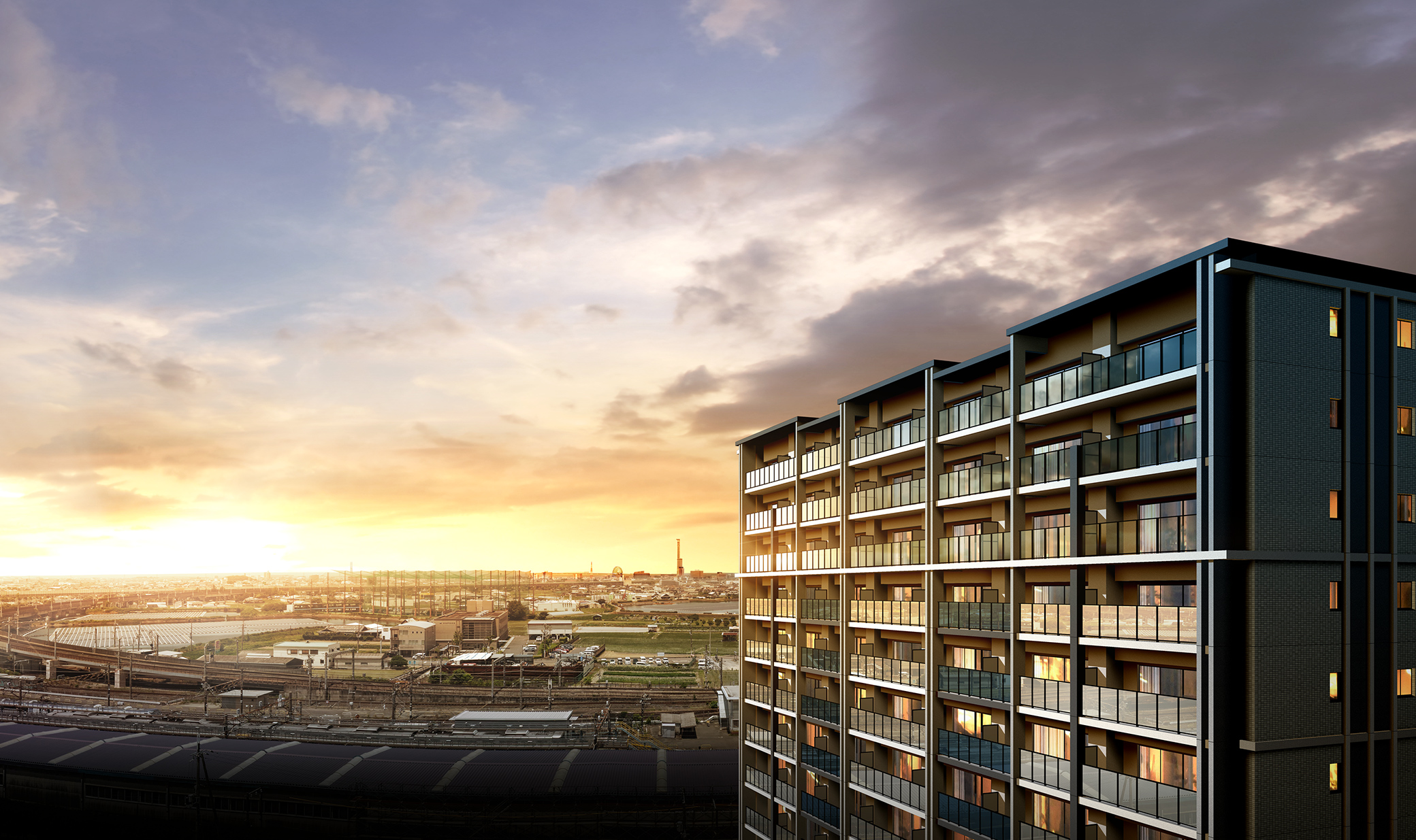 ※掲載の外観完成予想図は、計画段階の図面を基に描き起こしたもので、形状・色等は実際とは異なります。現地12階相当からの眺望写真(2025年6月撮影)にCGを合成したものです。実際の住戸からの眺望とは異なります。眺望・景観は、各階・各住戸により異なり、今後の周辺環境の変化に伴い将来にわたって保証されるものではありません。なお、形状の細部、設備機器等は表現しておりません。家具・照明・調度品等は販売価格に含まれておりません。また、施工上の都合、行政官庁の指導等により変更が生じる場合がございます。
