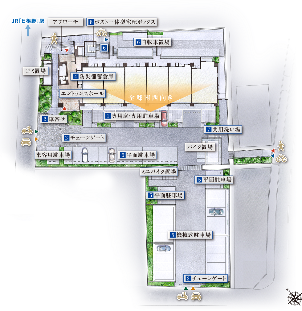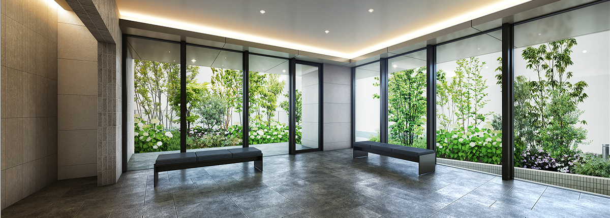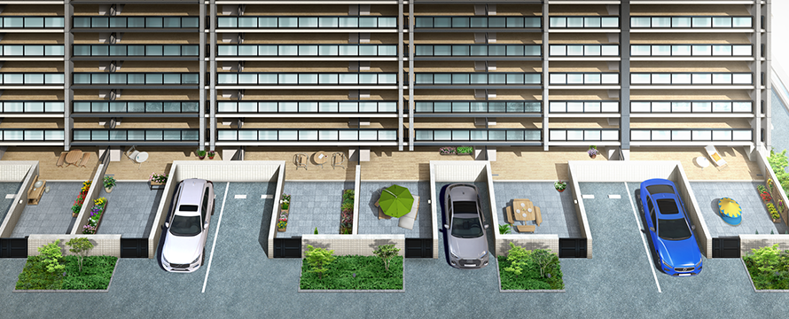 1階の6邸には、それぞれ専用庭と専用駐車場を設けています。専用庭ではガーデニングやランチ、コーヒータイムを愉しむなど、思い思いのひとときを満喫。専用駐車場なら、出し入れにかかる時間を気にすることもありません。戸建てのような感覚で暮らしを広げつつ、集合邸宅ならではの便利な共用設備やサービスを利用することができます。
