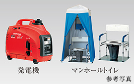 救急箱から発電機のような家庭では用意が困難な物まで、万一の災害時に役立つ防災備品を備えた倉庫を設けています。