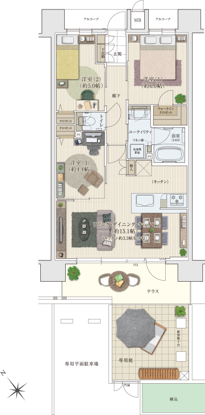 専用庭と専用平面駐車場が付いた戸建て感覚の1階住戸。リビングからテラスに行き来できる勝手口を設置。