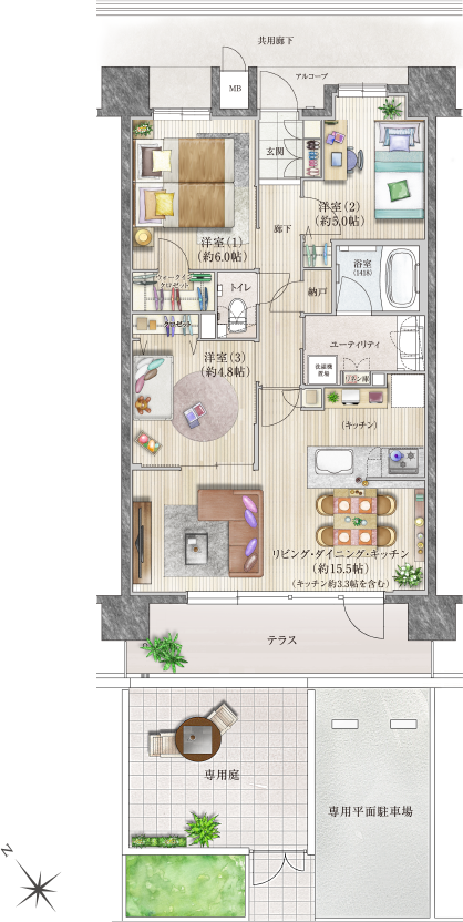 専用庭と専用平面駐車場が付いた戸建て感覚の1階住戸。リビングからテラスに行き来できる勝手口を設置