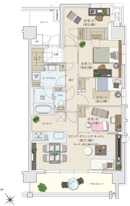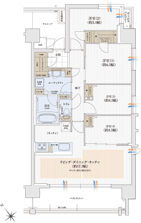 独立性の高い角住戸、洋室(4)の引き戸を開放すれば約21.8帖の広々リビングに。