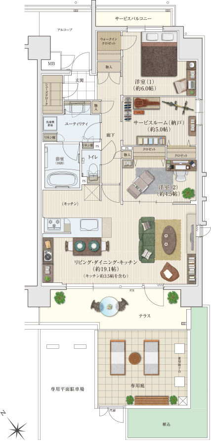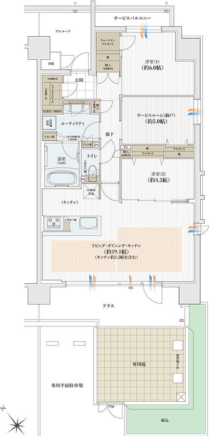 専用庭と専用平面駐車場が付いた戸建て感覚の1階住戸。リビングからテラスに行き来できる勝手口を設置。