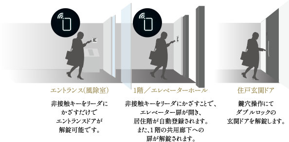 エントランスなどのオートロックには、キーをかざすだけで解錠できる非接触キーを採用しています。