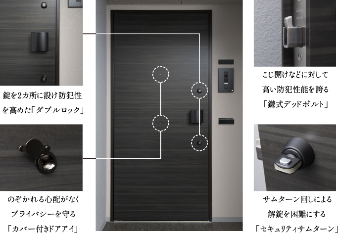 住まいを守る玄関ドアには防犯性に優れた「ダブルロック」をはじめ、不正解錠工具などによる解錠を困難にする防犯機能を搭載。対こじ破り性能、対サムターン回し性能など、防犯性能の向上を図っています。