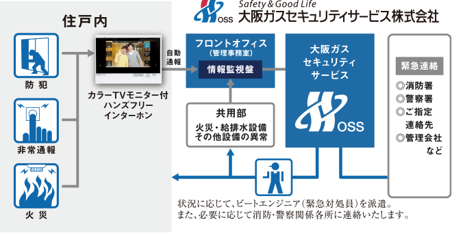 住戸内の防犯センサーや火災報知器が自動通報で知らせる異常発生や、給排水設備など共用部の設備機器の異常発生を、大阪ガスセキュリティサービスのコントロールセンターで24時間遠隔監視しています。