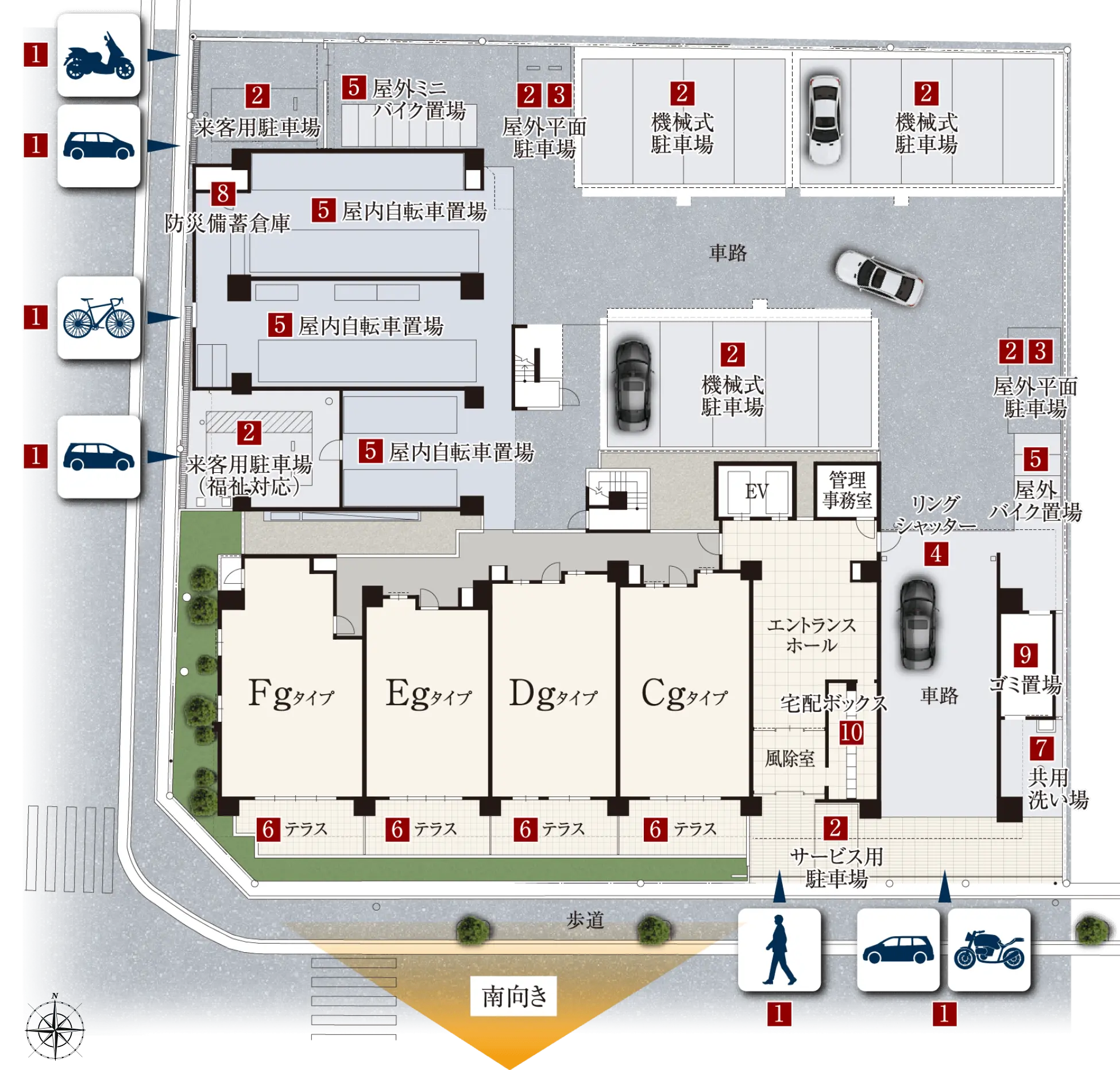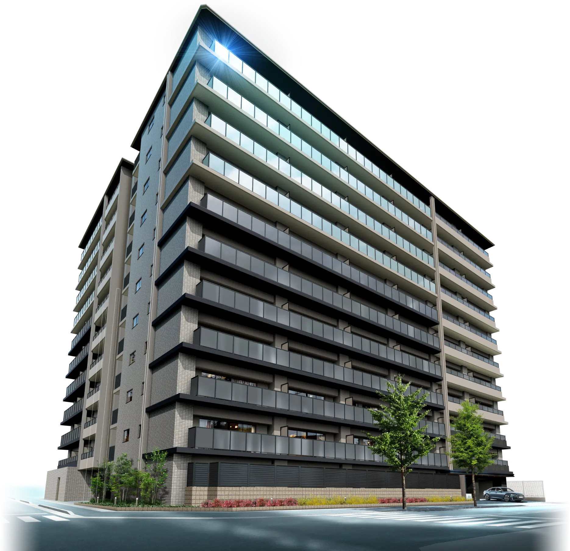- ※掲載の完成予想図は、計画段階の図面を基に描き起こしたもので、実際とは異なります。植栽は、特定の季節やご入居時の状態を想定して描かれたものではありません。周辺道路・建物等は簡略化しております。雨樋、エアコン室外機、給湯器、TVアンテナ等再現されていない設備機器等がございます。
