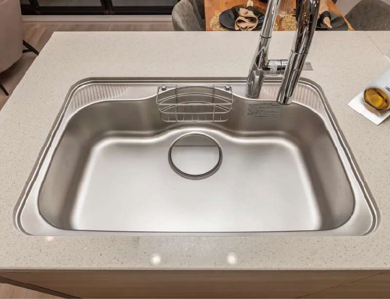 - 中央部に奥行をとって、大容量の魅力はそのままに幅をスリム化。スポンジ等の置き場に便利な小物置き付です。