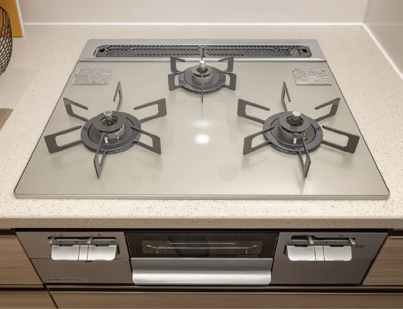 - 天板部の細部まで美しいガラストップはお手入れも簡単。すべてのバーナーに安心センサーを搭載し、水無し両面焼きグリル付です。
