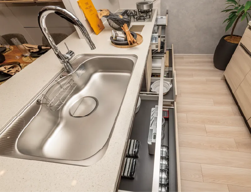 - 出し入れスムーズで奥まで物をしまえて、巾木部分も収納として活用できます。静かにゆっくり閉まるソフトクローズタイプです。