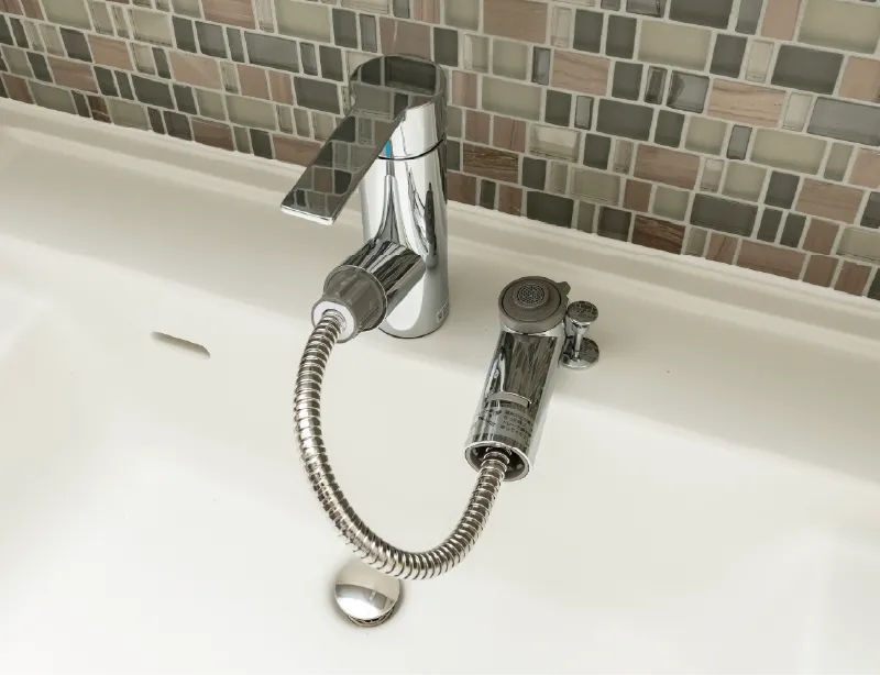 - シャワーと整流を切替できる水栓。吐水口部が引き出せるので、ボウルのお手入れにも便利です。