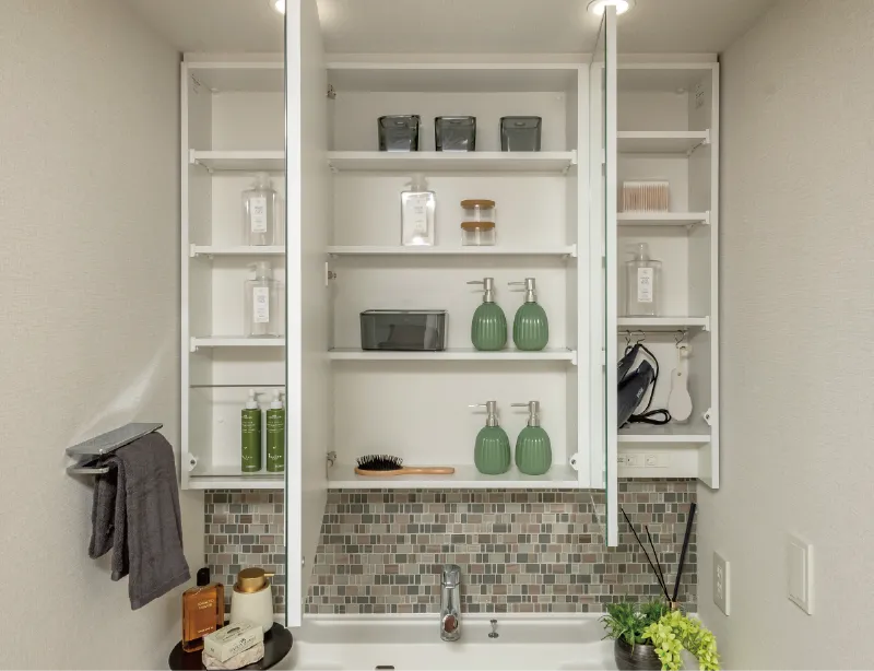 - 洗面小物等を効率的に整理できる多機能収納棚を設置しました。ドライヤー、ティッシュボックスなどの専用スペースも備えています。