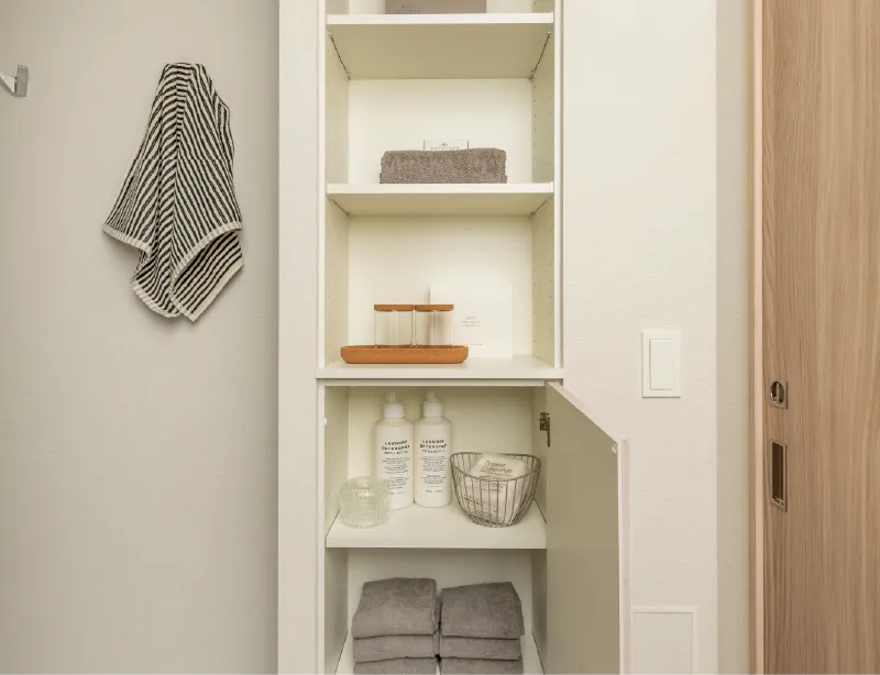 - 洗面小物のストックや洗剤、タオル、入浴の際の着替えなどの収納スペースとして、リネン庫を設けました。