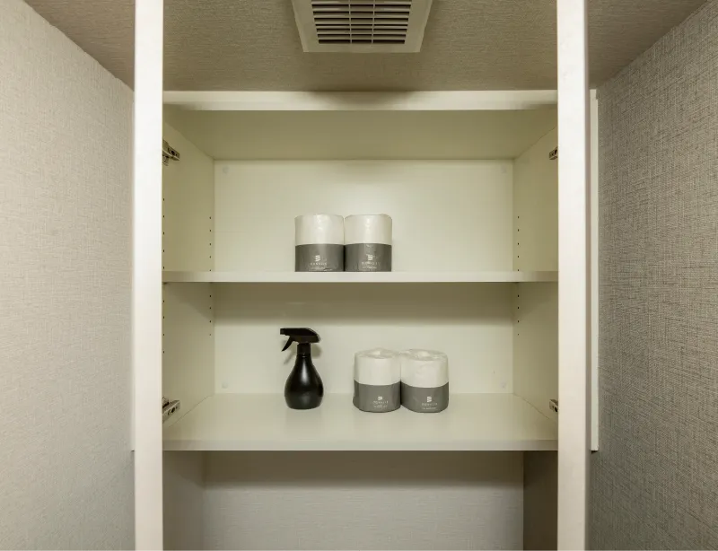 - 上部のデッドスペースを活用し、トイレットペーパーや掃除用具のストックなどに便利な吊戸棚を設けています。