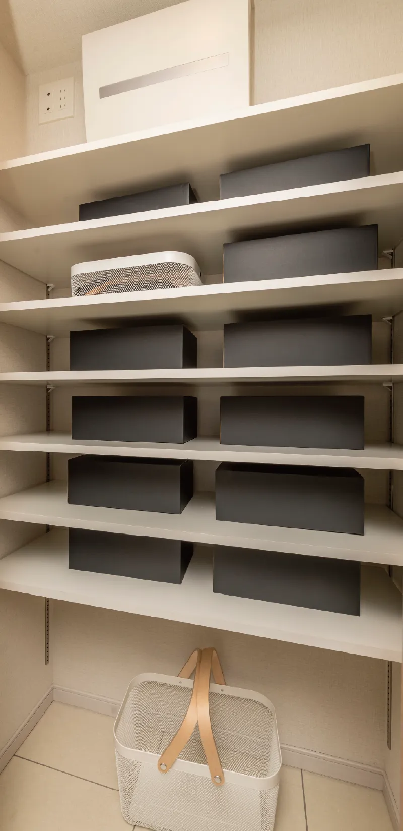 - 棚位置を変えられる可動棚タイプのため、ブーツなどもすっきり片付けられます。傘などの収納も可能です。