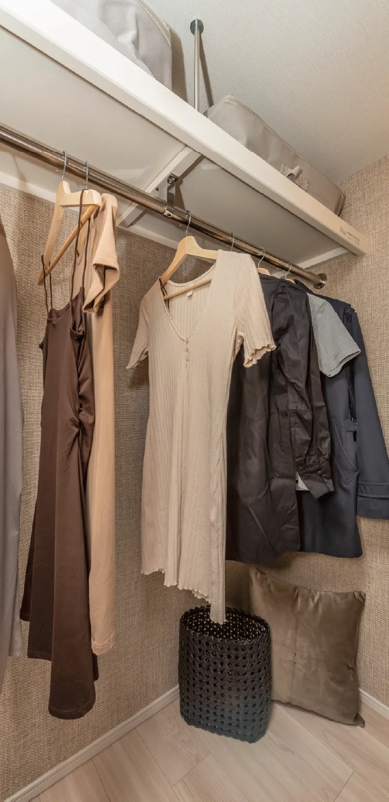 - 帽子やバッグなどを整理しやすい棚や、衣類などを十分に収納できるハンガーパイプを装備。
