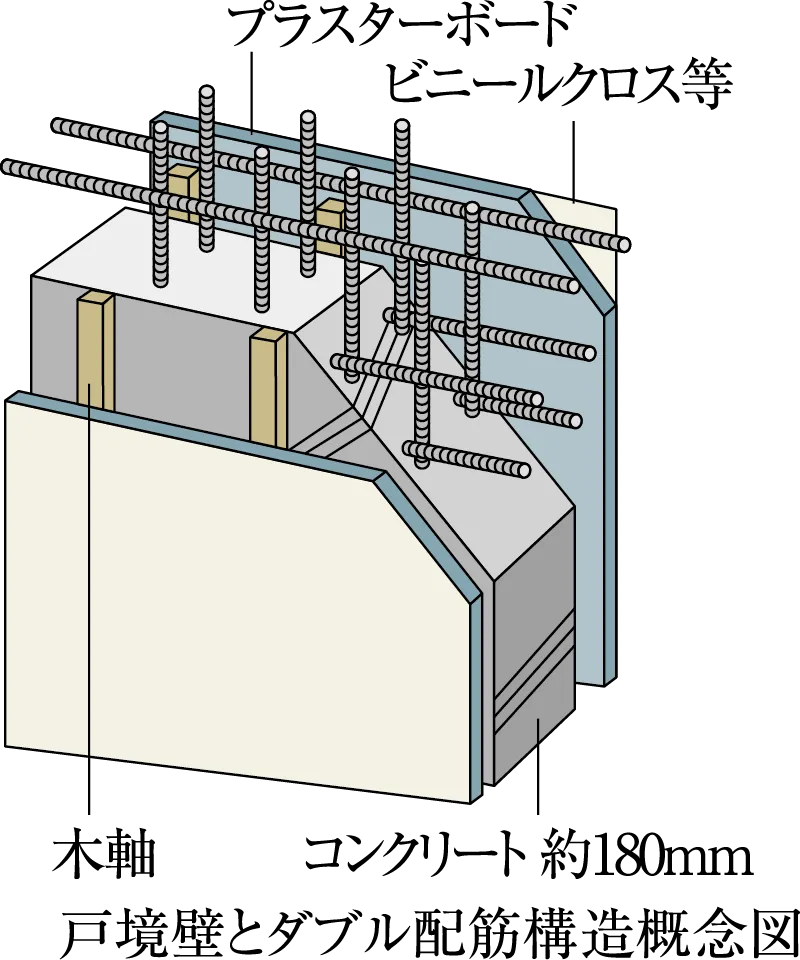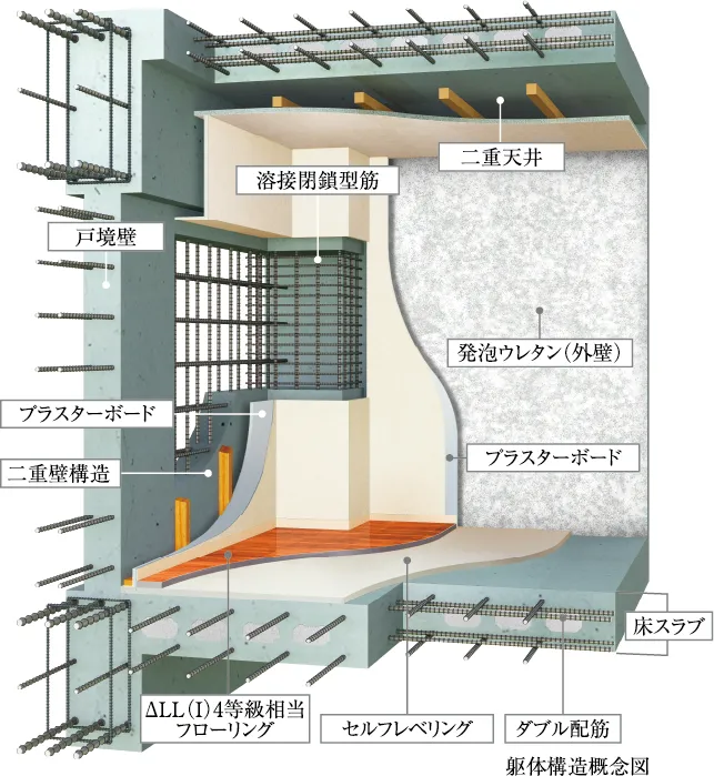 - 隣住戸との間の戸境壁はコンクリート厚約180mmを確保し、生活音を軽減します。また、鉄筋を二重に組むダブル配筋を採用。シングル配筋よりも高い強度と耐久性を実現します。