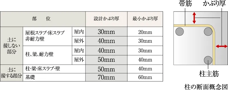 (かぶり厚) - コンクリートの中性化が極度に進むと、コンクリートの内の鉄筋が錆びて体積が増し、コンクリートの破損の原因にもなります。これを防ぐため、鉄筋を覆うコンクリートの厚さは、建築基準法で定められた最小かぶり厚よりも10mm上回る水準を設計かぶり厚とし、最小かぶり厚以上のかぶり厚を確保するよう努めます。