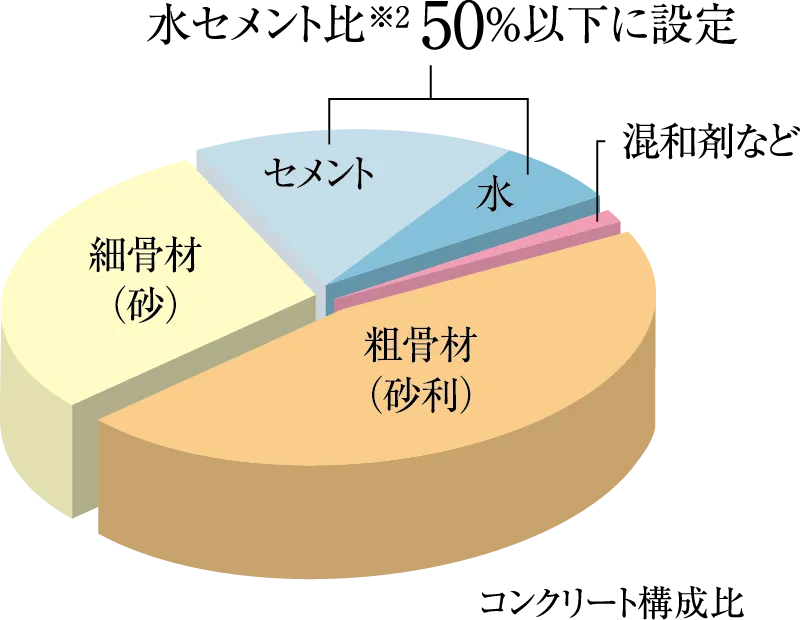 - 鉄筋の腐食はコンクリートの中性化により生じます。すなわち中性化を起こす大きな要因となる、水セメント比を小さくすることがよいといわれています。そこで、水セメント比を50%以下※1に設定し、中性化を防ぐように配慮しています。