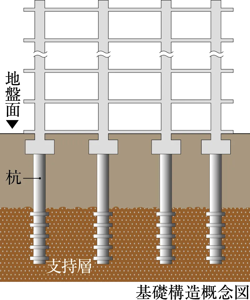 - 地盤調査の結果、約4〜5m以深に支持地盤となる砂礫層が確認されています。その支持層に既成コンクリート杭を打設し、杭先端の支持地盤により建物を強固に支持しています。
