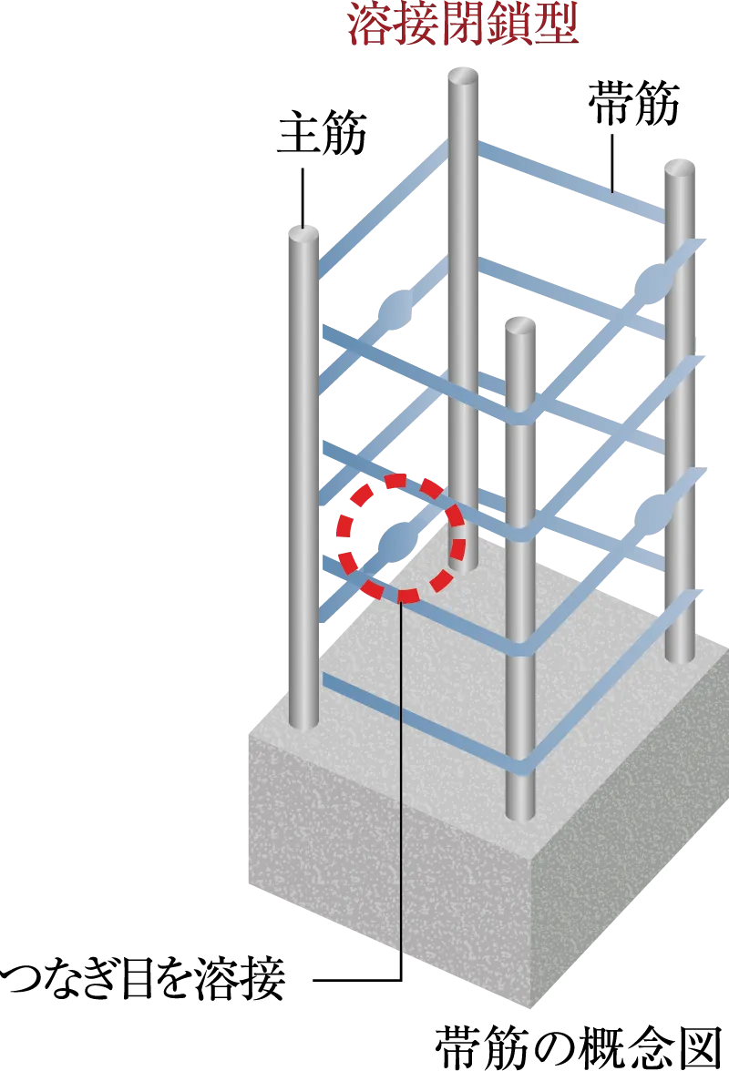 - 帯筋とは柱の主筋に直交するように配筋する鉄筋です。帯筋の形状に柱の剪断破壊に対する耐力の高い溶接閉鎖型(つなぎ目を溶接したもの)を使用することで、耐震性の高い構造体をつくります。(一部除く)