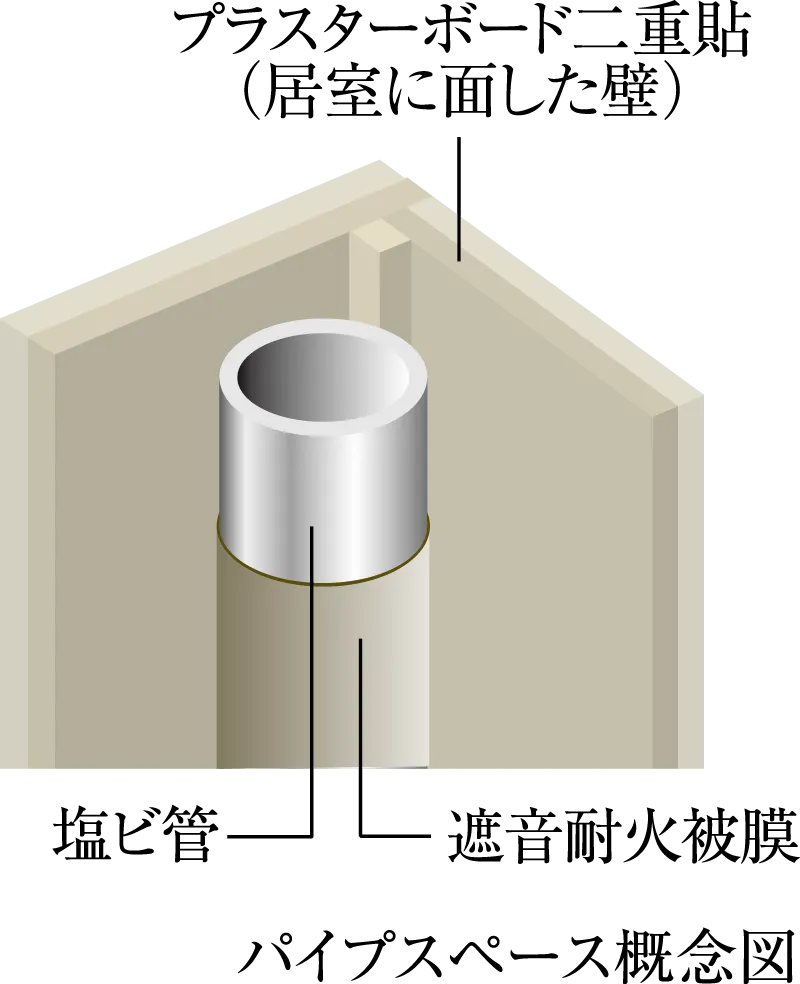 - 寝室(居室)に面したユーティリティ・トイレ・浴室の間仕切り壁はグラスウール+ボード二重貼としています。寝室(居室)に面した水まわりの排水管はボード二重貼+遮音耐火被膜とするなど、生活排水などに対する音にもきめ細かな配慮を行っています。