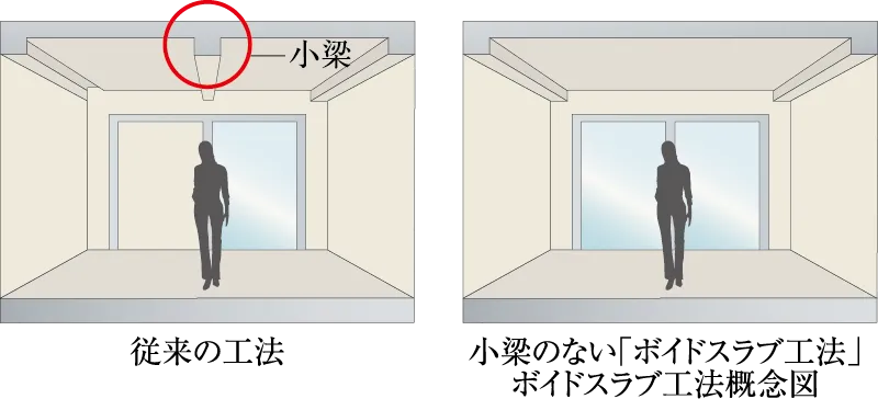 ボイドスラブ工法 - 在来スラブに比べ剛性が高く、遮音性能に優れるボイドスラブを採用。さらに天井に小梁が出ない、すっきりと伸びやかな住空間を実現します。