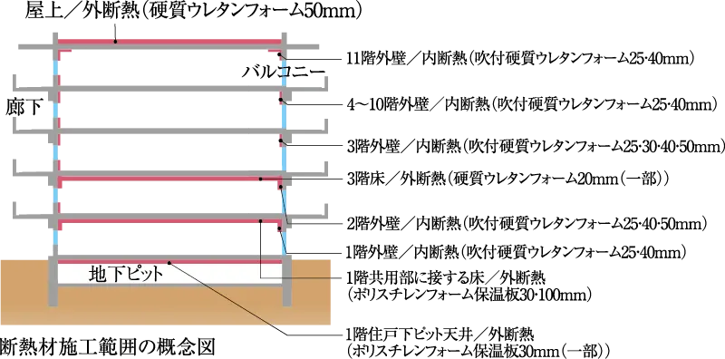 - 屋上に約50mm厚、外壁に約25・30・40・50mm厚、最下階住戸床に約30・100mm厚の断熱材を採用。また、最上階については外壁沿いの住戸内の壁・柱・梁から約450mm折り返して(一部)、約20mm厚の断熱材を施し、住戸内の壁への冷気の伝わりを緩和して結露を抑制します。