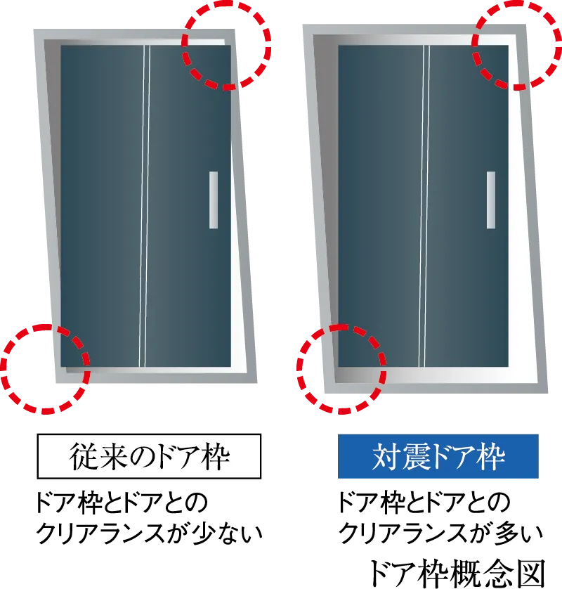 万一に備えた対震ドア枠付玄関ドア - 万一の地震の際に玄関のドア枠が多少変形してもドアが開くよう、ドアとドア枠の間にすき間を設けています。また、ドアガードや鍵受も、ドア枠が多少変形しても引っかからないような形状とし、施錠時に地震が発生しても解錠しやすいよう配慮しています。