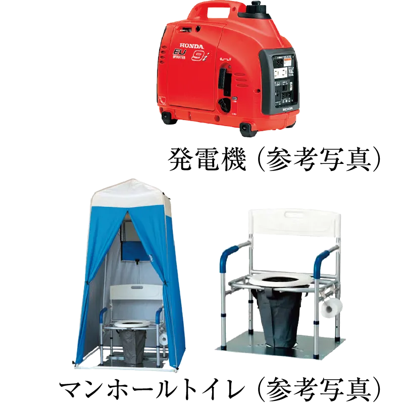 - 災害の際、マンホールに設置するだけで使用できる組み立て式の簡易トイレを備えています。