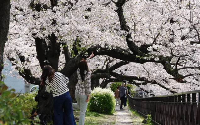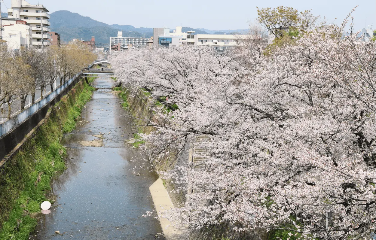 西岸からは桜並木を一望でき、川沿いには遊歩道やベンチも整備されており、
