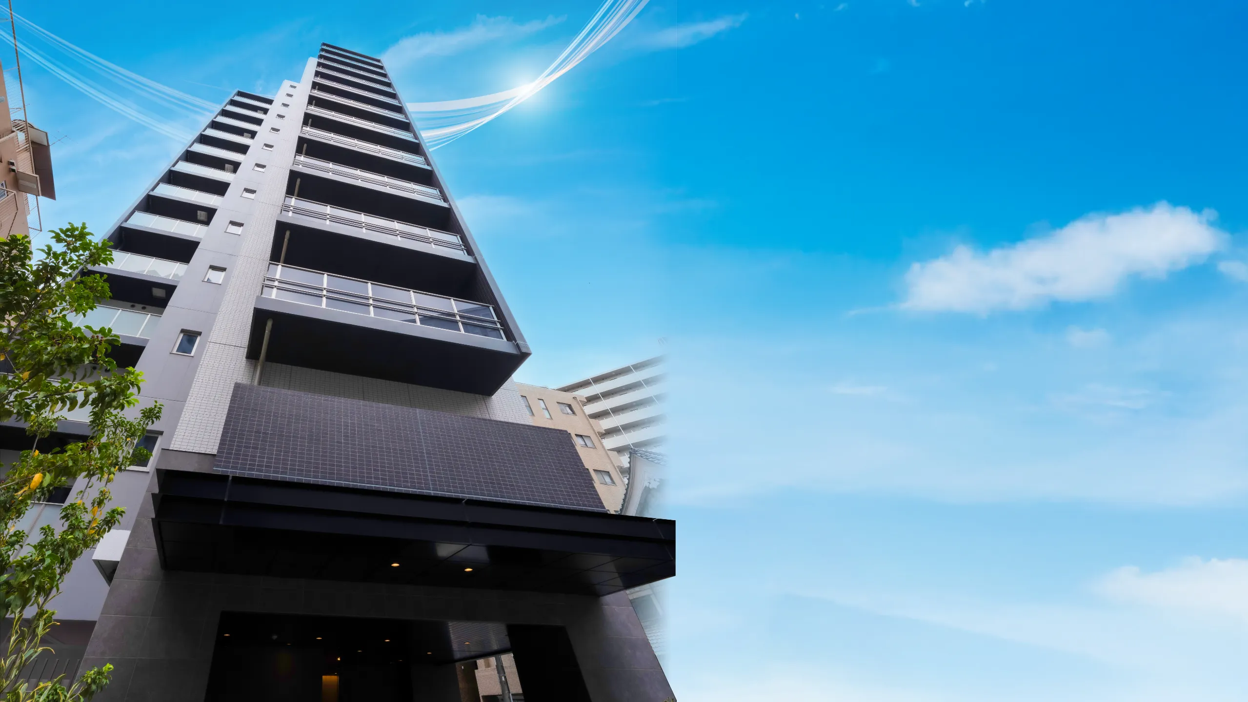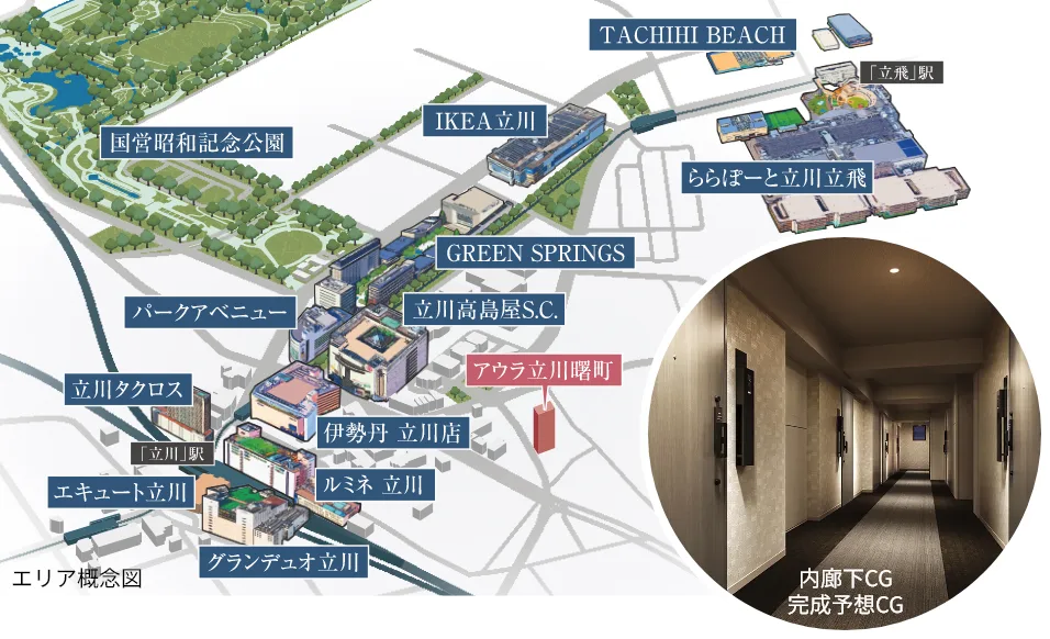 ※掲載の完成予想図は設計図を基に描き起こしたもので官公庁の指導、施工上の都合等により建物の形状・色調等に変更が生じる場合があります。外観形状の細部、設備機器等は簡略化しております。植栽は計画段階のもので変更になる場合があります。特定の季節、時期、または入居時を想定して描いたものではありません。葉の色合い、枝ぶりや樹形は想定であり、竣工時は完成予想図程度には成長していない場合があります。予めご了承ください。