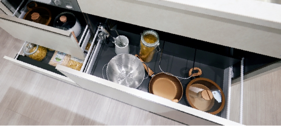 ソフトクローズレール採用で静かでスムーズな開閉が可能なスライドキャビネット。奥までたっぷり収納でき、巾木部分にも収納できます。※一部除く