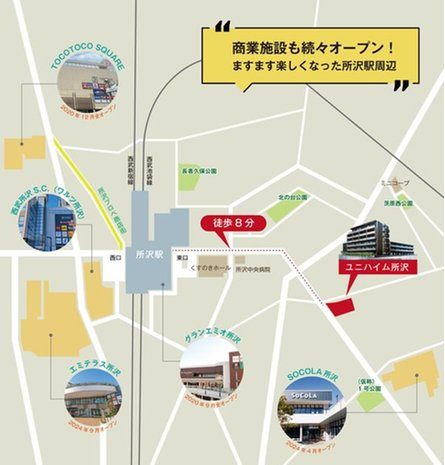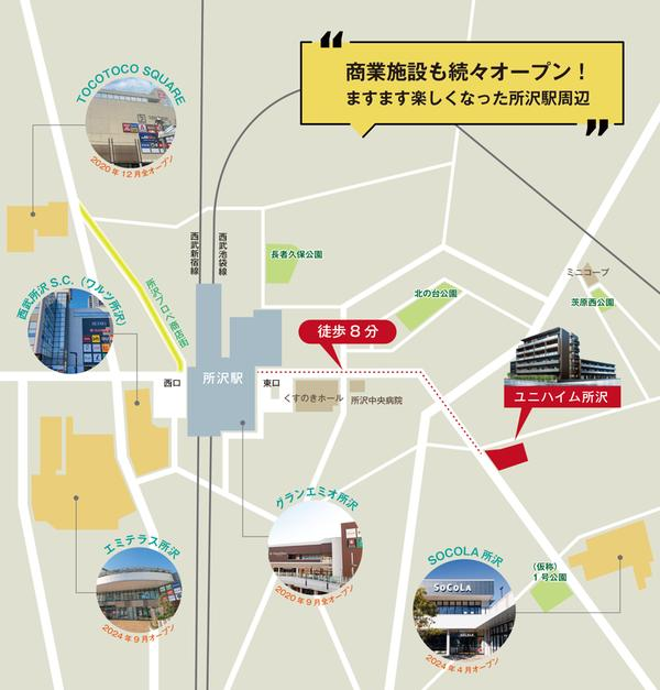 駅直結のショッピングモール「グランエミオ所沢」の2020年9月のオープン以降、「TOCOTOCO SQUARE」「エミテラス所沢」「SOCOLA(ソコラ)所沢」と続々と商業施設がオープン。今後の発展にも期待が集まっています。
