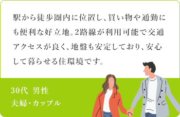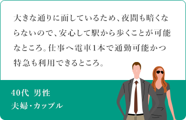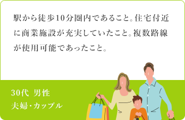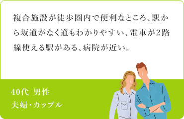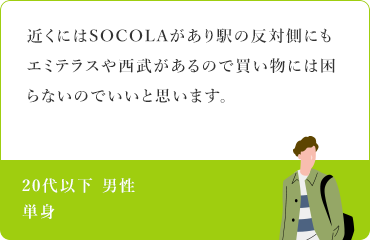 〈ユニハイム所沢〉のご契約者様アンケートから、評価の高かったポイントを挙げてみると、『駅徒歩8分の近さ』『充実した買い物環境』と合わせて『街の将来性』に注目している人が多いようです。